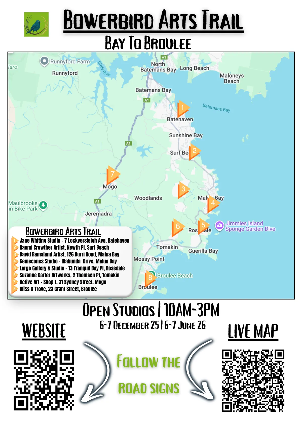 The Bowerbird Arts Trail is a new creation involving likeminded artists from the Bay to Broulee. We hope that through our collaborations we have created an easily accessible art experience for locals and visitors to the region. We appreciate, not everyone wants sunburn…or to watch whales…or to take their dog for a swim…or ride their bike…or hike our Munjip Trail…or do any other of the multitude of activities available on any given day. Some people like their art too!